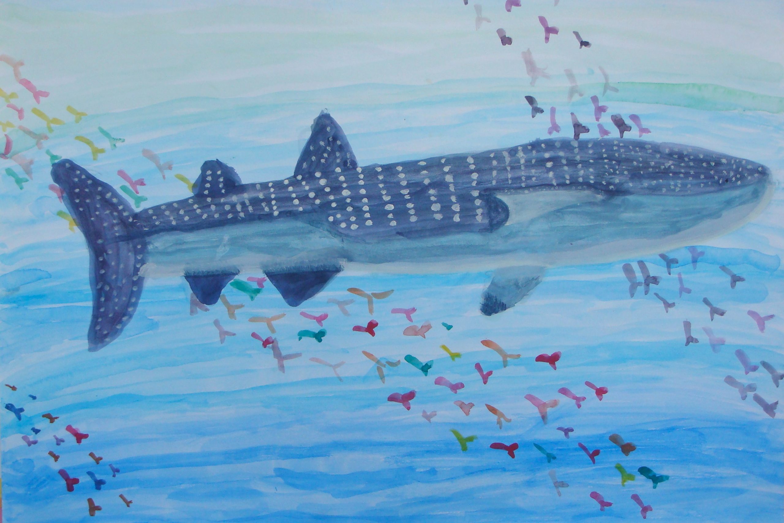 ジンベイザメの魚体の色合いなどリアルに描けていてよい。