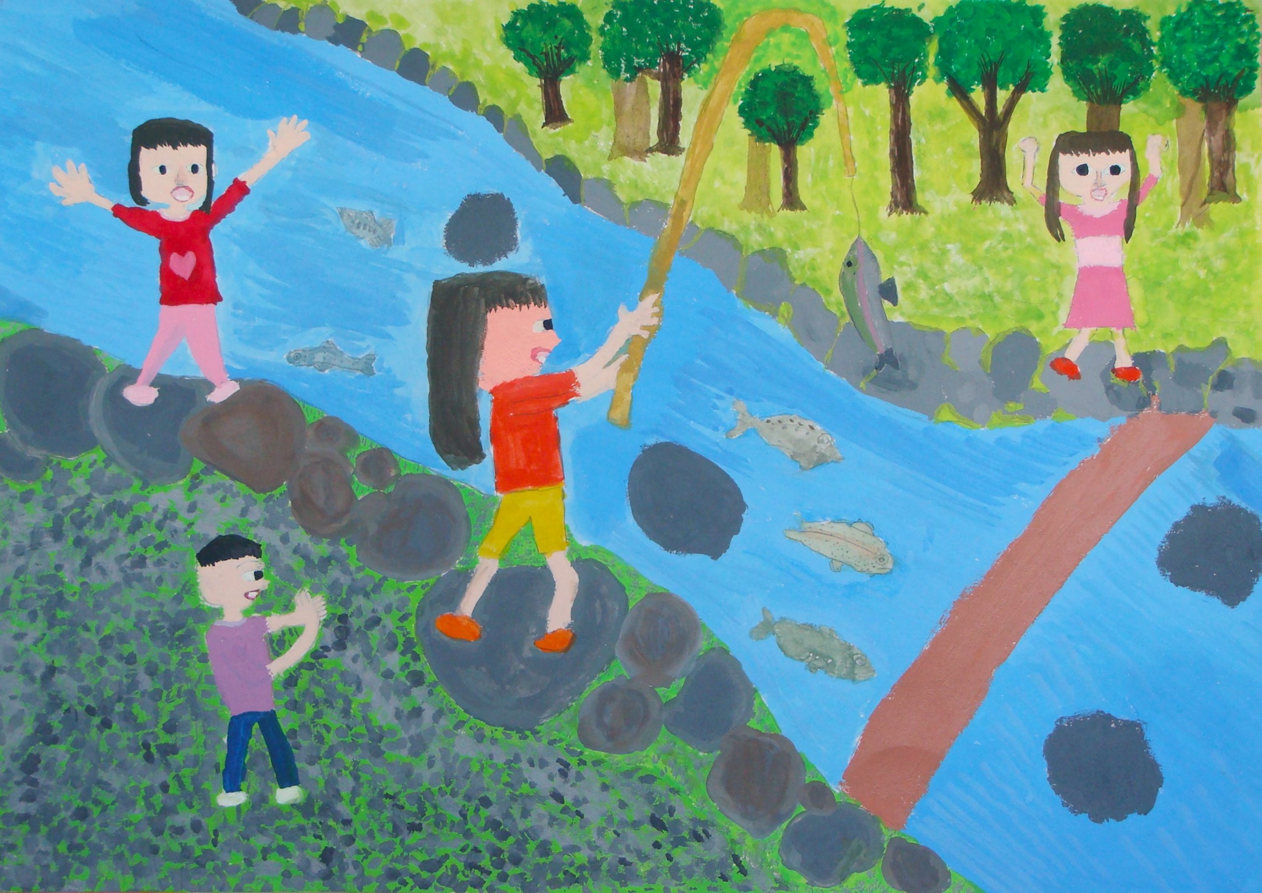 川の周りにいる友達が「よく釣ったな!」と喜んでくれている様子も伝わるし、水辺の縁の石だとか遠景の木だとか、それぞれ色を変えたりして丁寧に描いていることが感じられる。