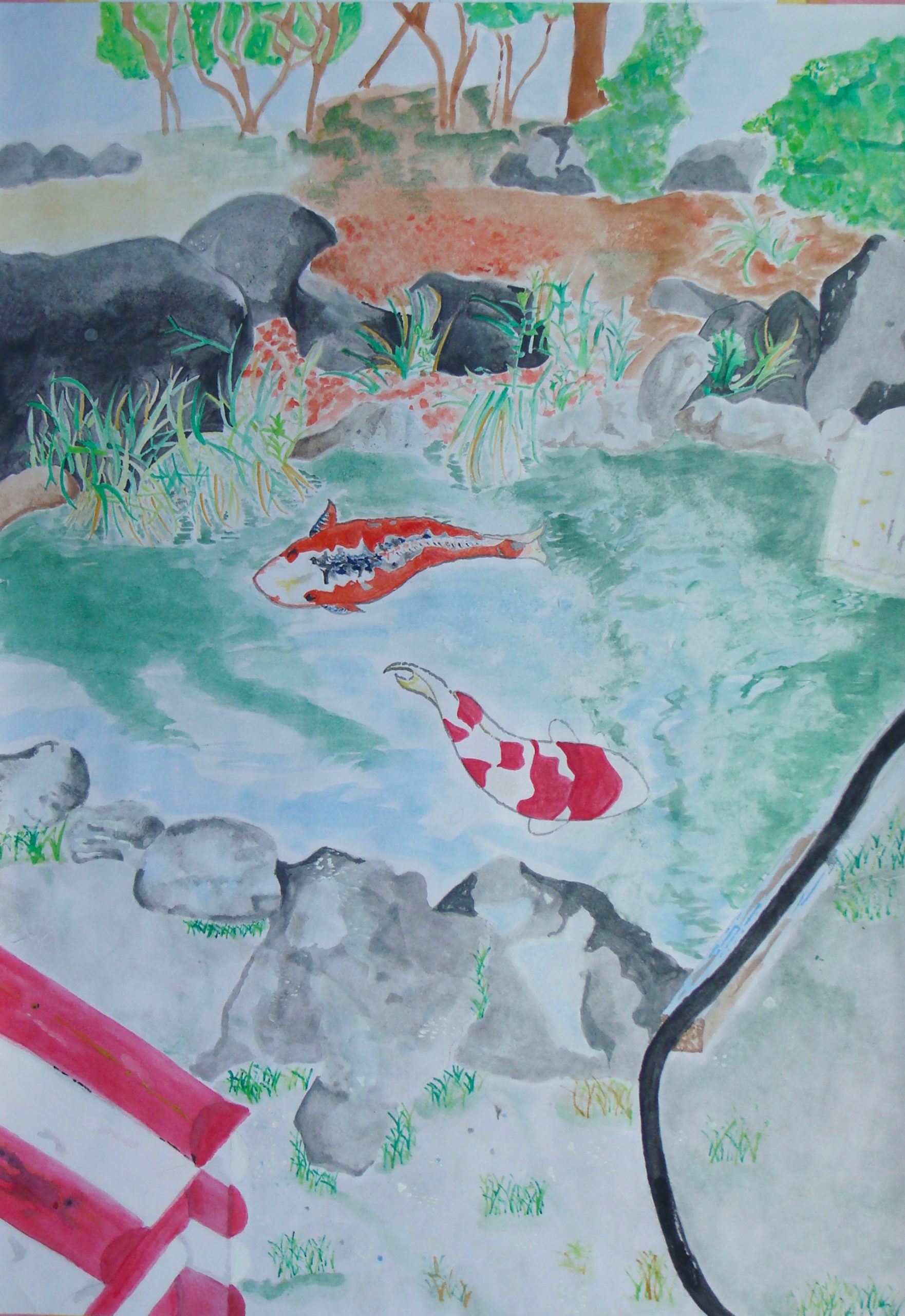 ビルのような直線だと遠近感を出しやすいが、この絵では、手前の池の縁の岩を大きく描き、順次奥にいくにつれてモノを小さく描くことで空間の奥行きを感じさせることに成功している。