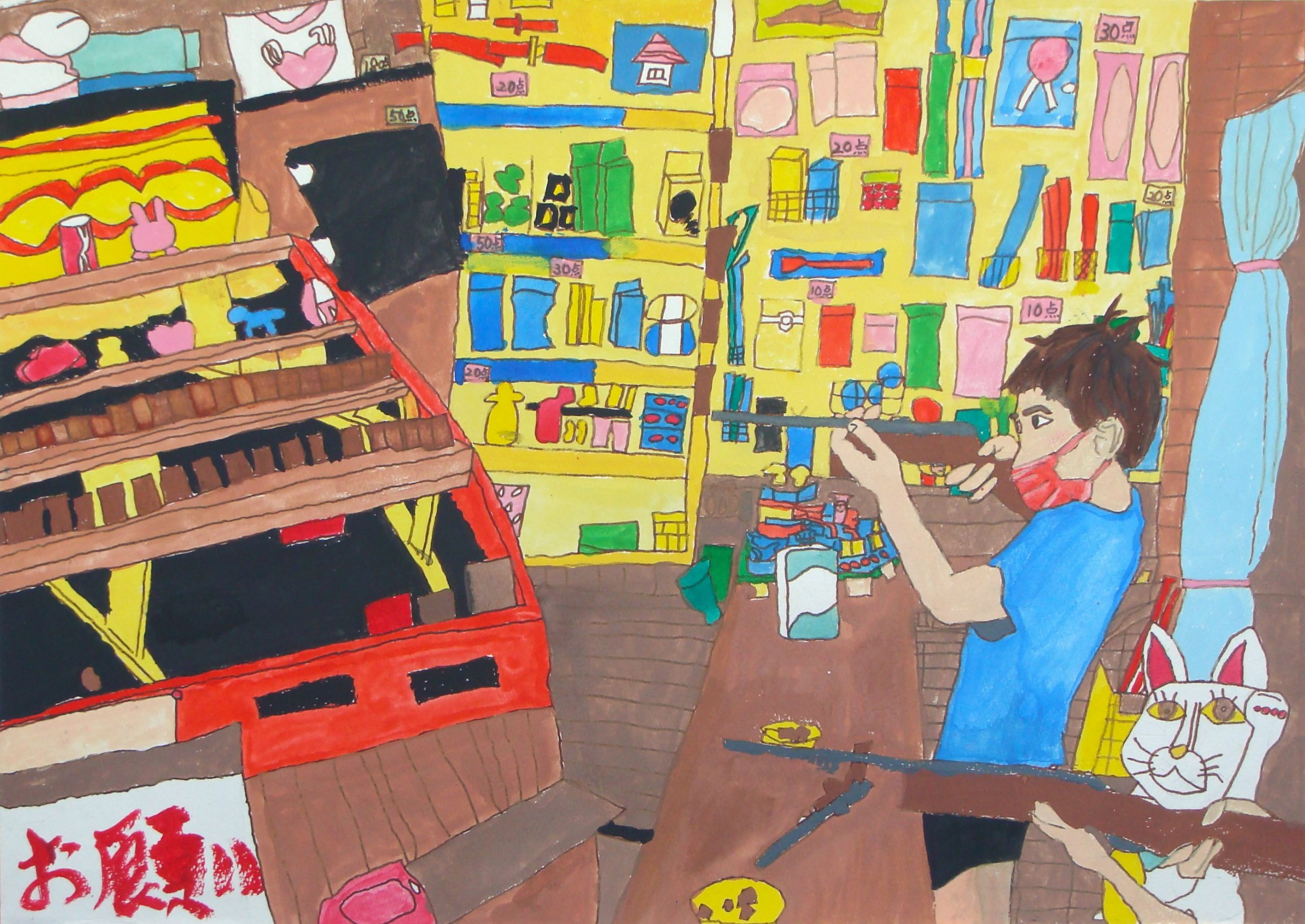 様々な景品や品物の並んでいる店の様子が、奥行きも幅も感じさせるようよく描きこまれている。