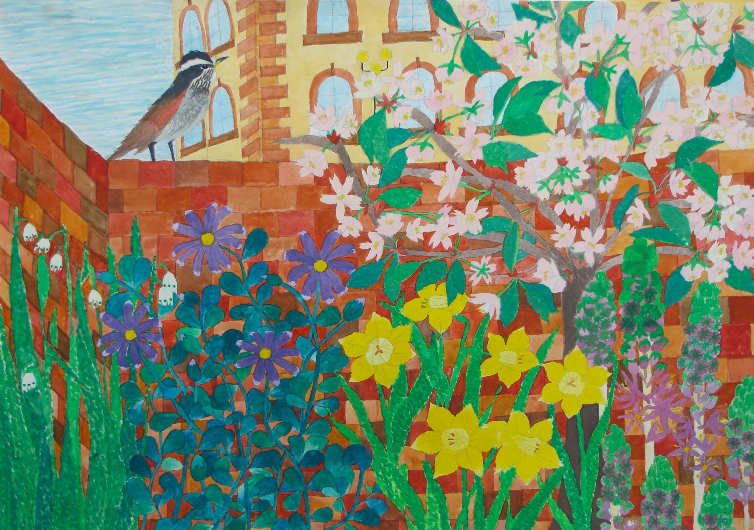 背景のレンガ造りも手を抜かずに描かれていて、手前の花との組み合わせが美しい。