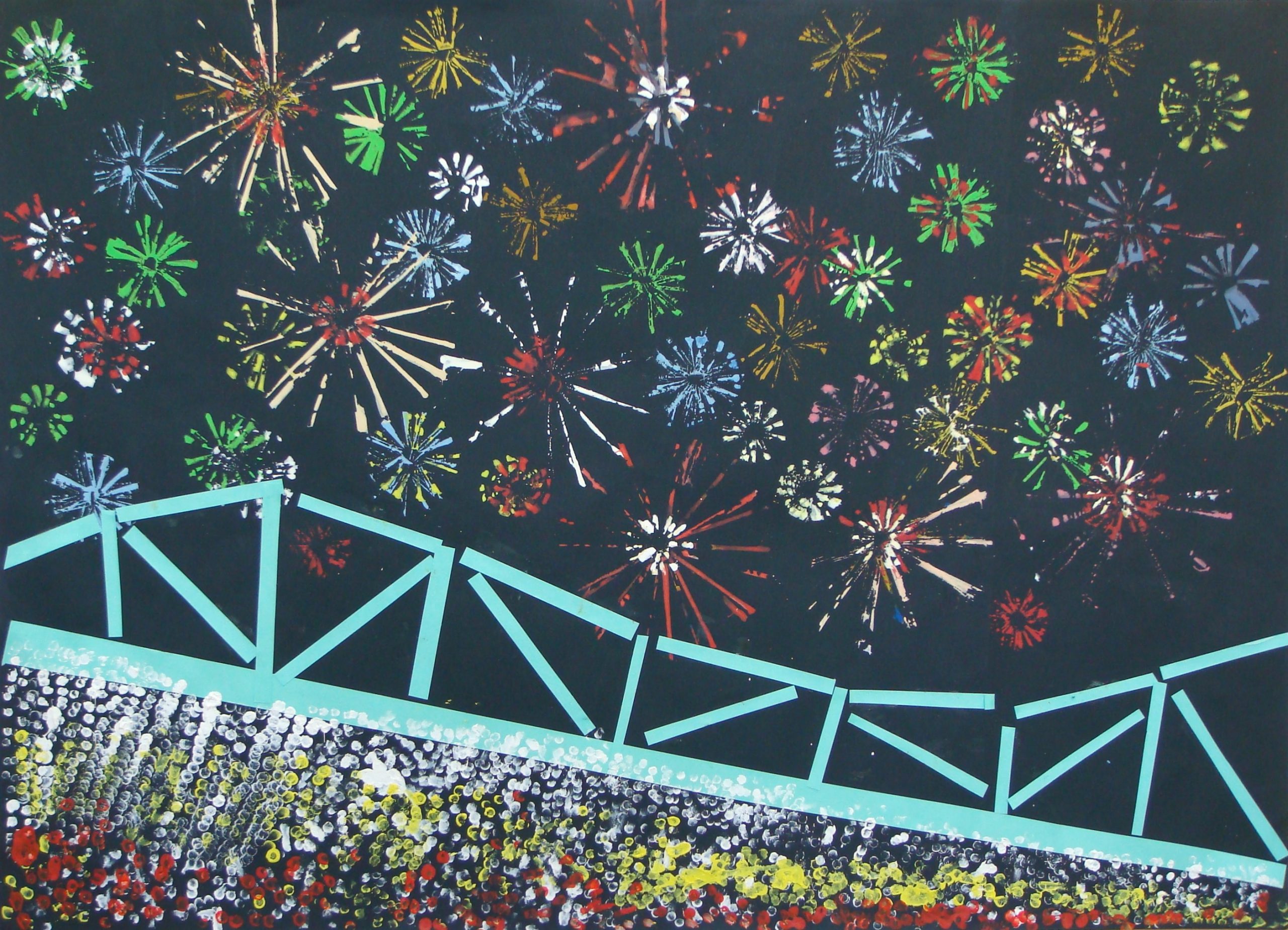 チューブから出した絵の具を薄めないでそのままつけることで暗い夜空に咲き誇るような花火を美しく描いている。