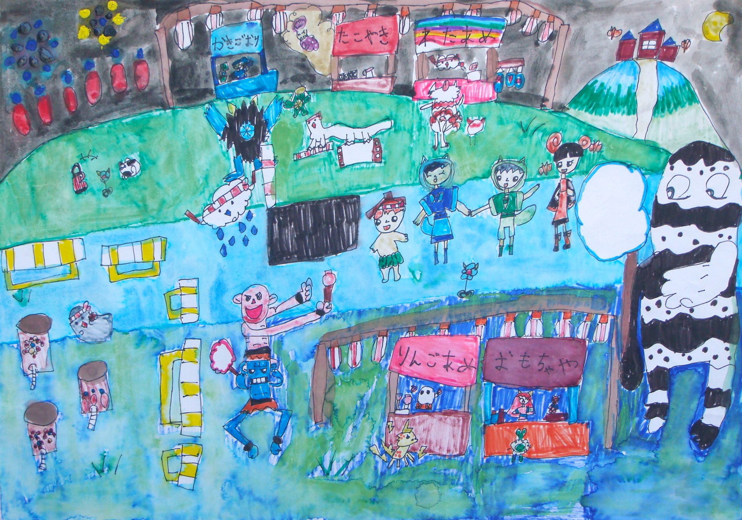 りんご飴を売っている屋台が出ていたり、お祭りをして盛り上がっている感じが表現できている。