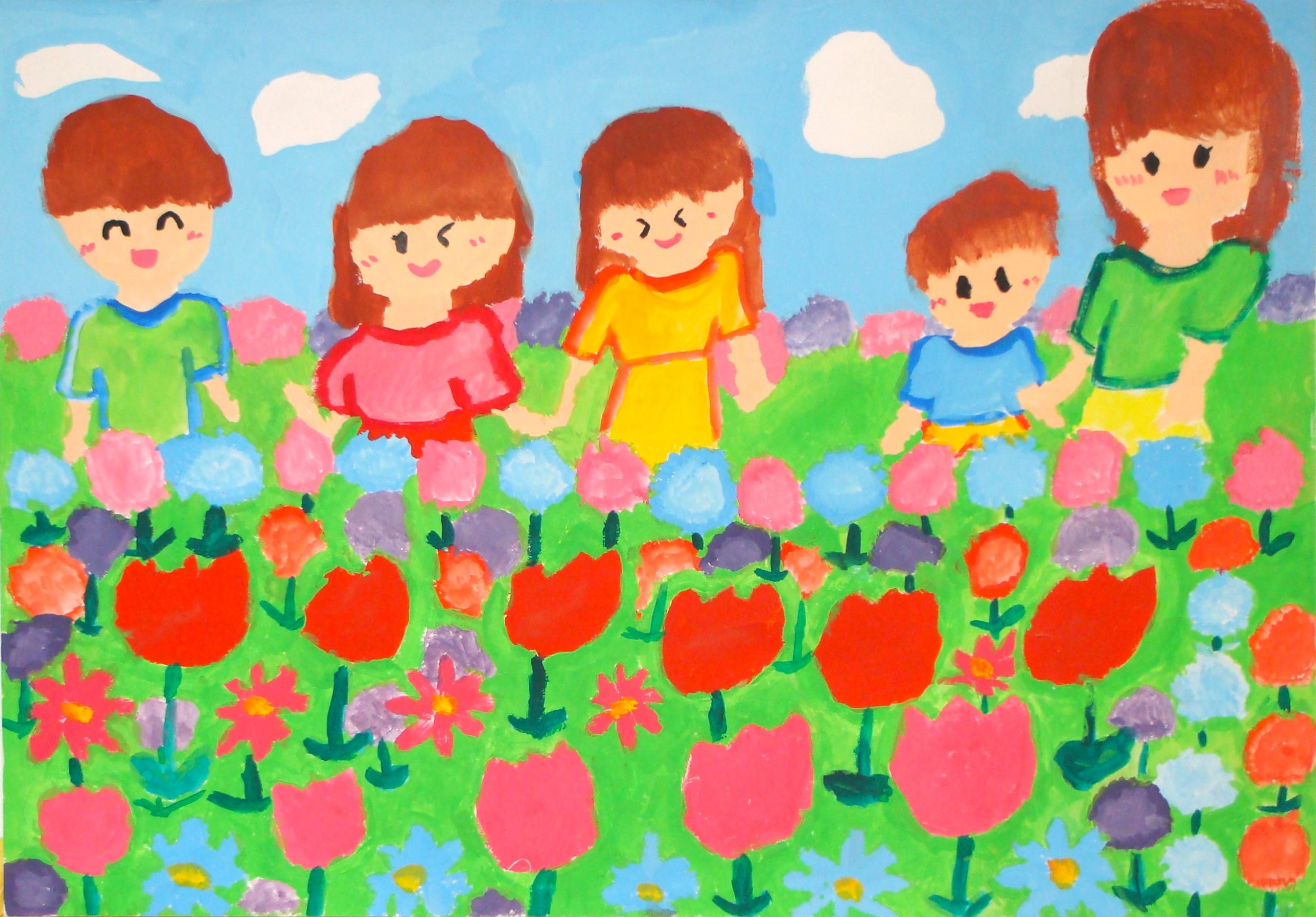 お花をかいたり、人をかいたり、いろいろと大へんだったけどきれいなお花畑の絵になってうれしかったです。
