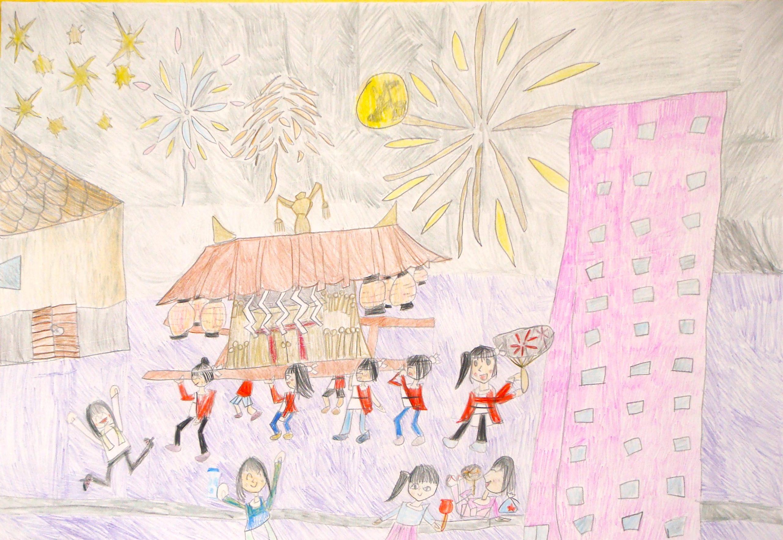 色鉛筆か何かで線を描いて色をつけているが、細かい所まで描きこんでお祭りのにぎやかさが伝わってくる。