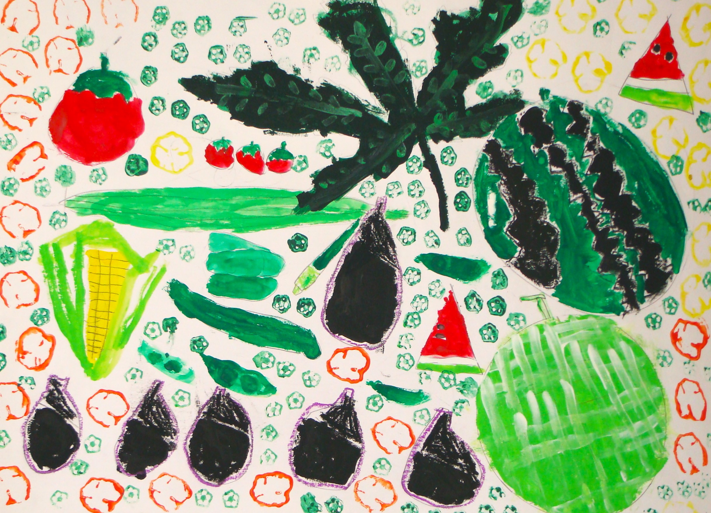 スイカ、ナス、トマト、トウモロコシなどの夏の野菜や果物を画面全体に配置して、スタンピングという技法で、たぶんオクラだと思うが、茎を切って絵の具をつけて画面にスタンプして散らしている。