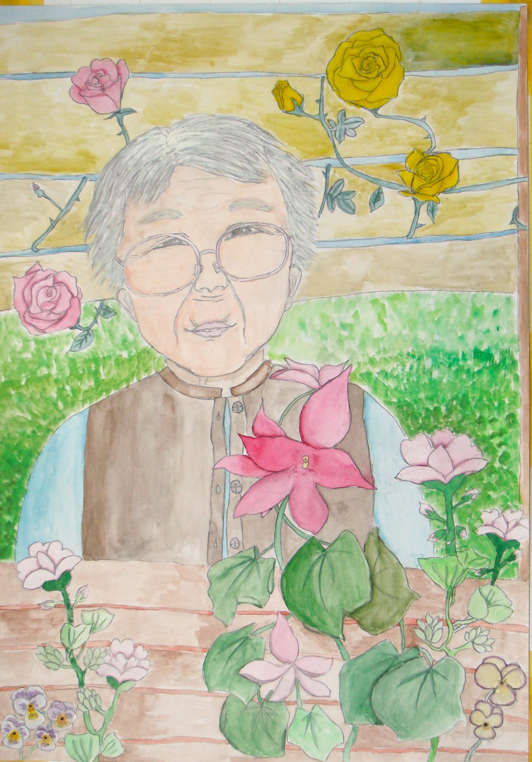 私のひいおばあちゃんが庭のお花に囲まれているところを絵に描きました。にこにこやさしく笑っている姿が描きたかったからです。
