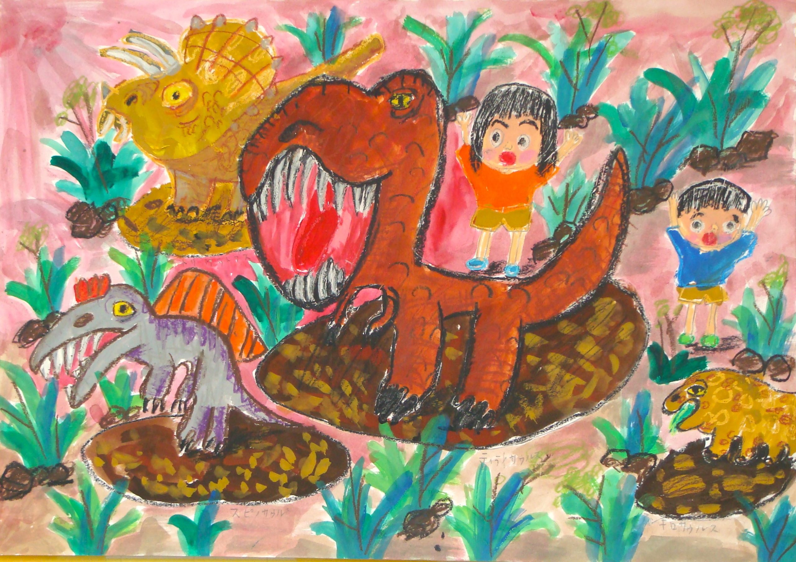 ときメッセの恐竜展を見に行った時の絵を描きました。絵本やテレビで見ていた恐竜が、ほんものになって目の前にいたので少し怖かったです。