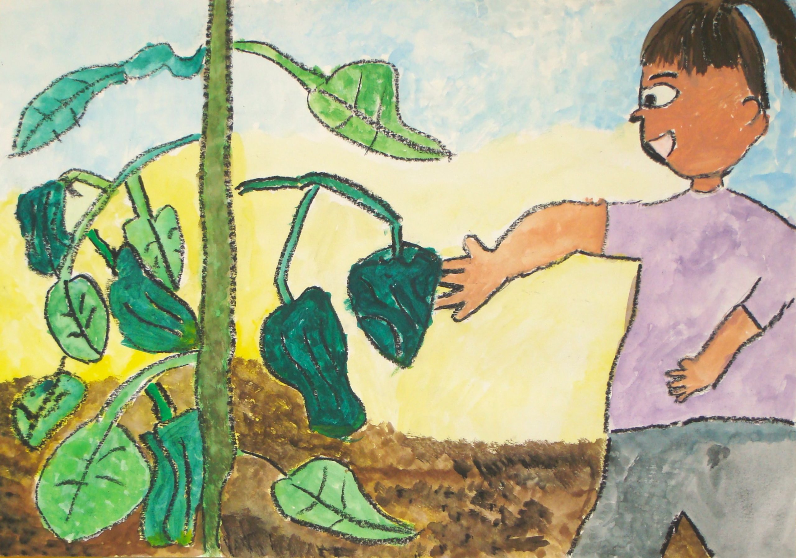 わたしは、学校でピーマンをそだてています。夏休みになんかいもピーマンのかんさつに行ったので、そのときのようすをえにしました。