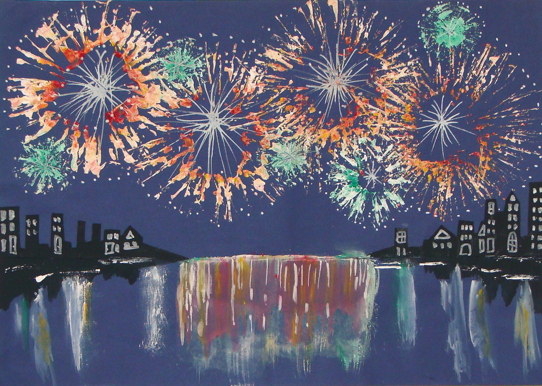1つ目は花火です。花火はトイレットペーパーのしんをつかってかきました。ペーパーのしんの先を切って絵の具をつけてかきました。