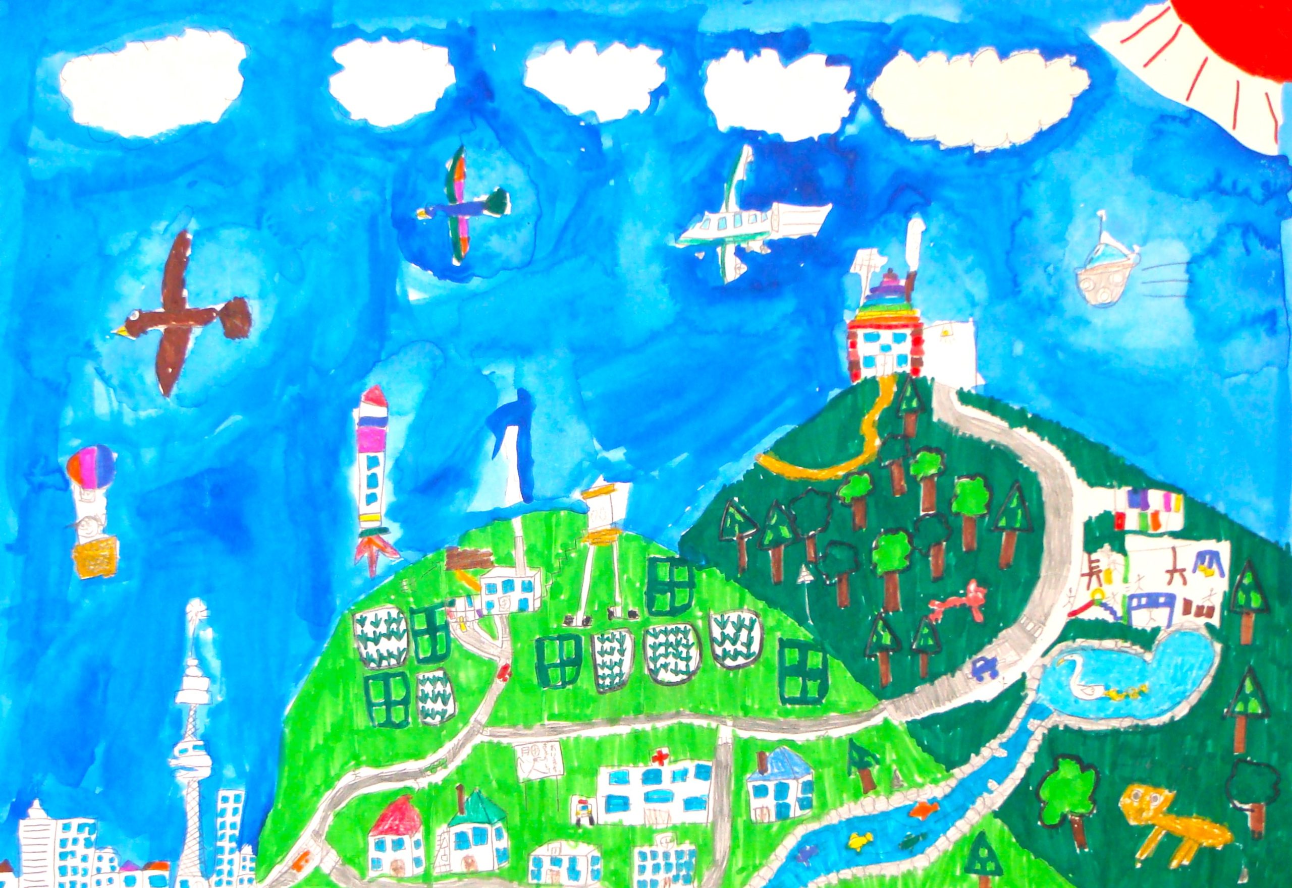 ふもとに広がる都市と、山の中の住宅を細かく描きわけ、道路と水路の色をかえ、空には鳥や飛行機や気球を飛ばし、にぎやかで楽しそうな未来の町を描いている。