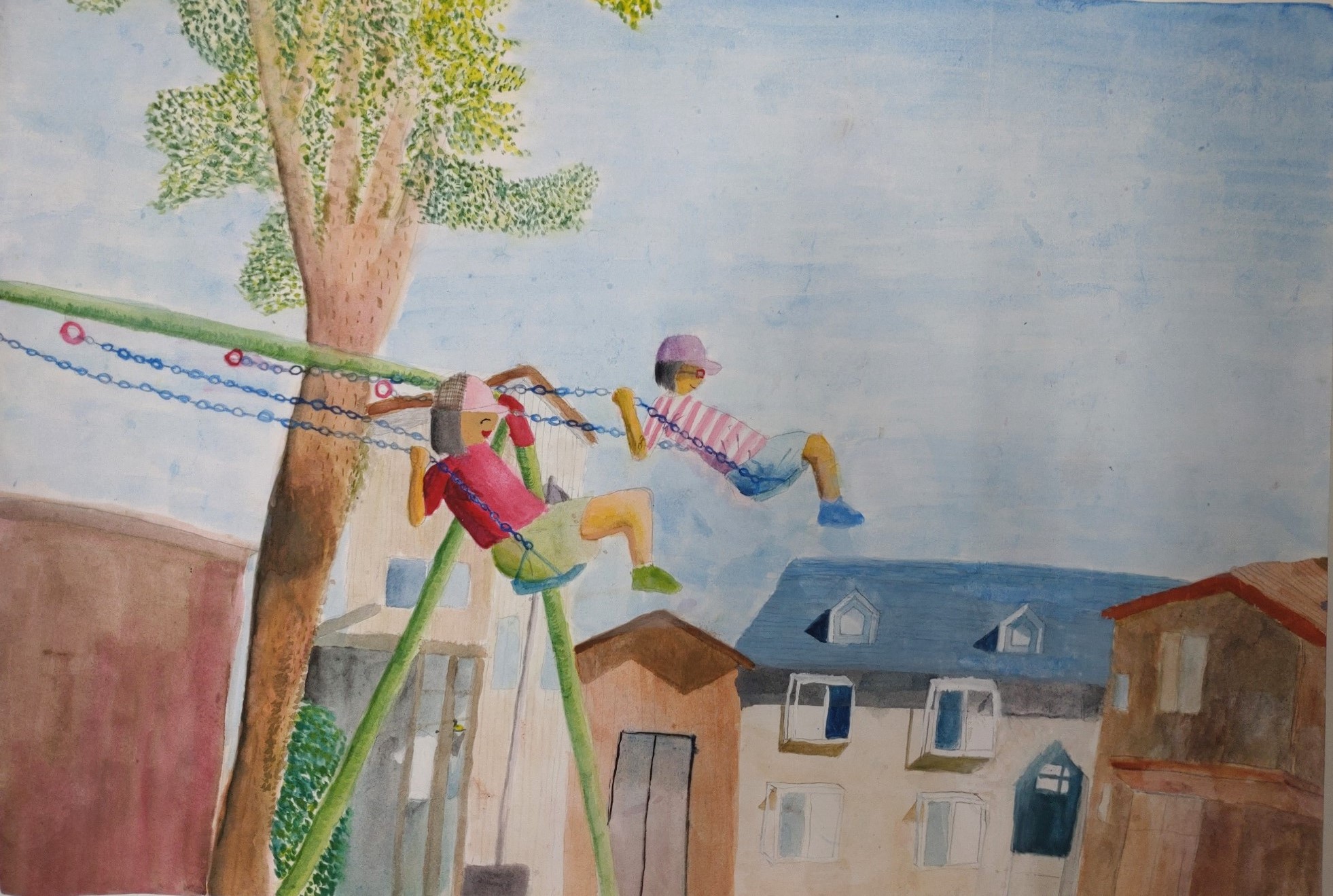 横から描いたブランコはこれまで見たことがない。色も美しくて、澄んだ空気を感じさせる。