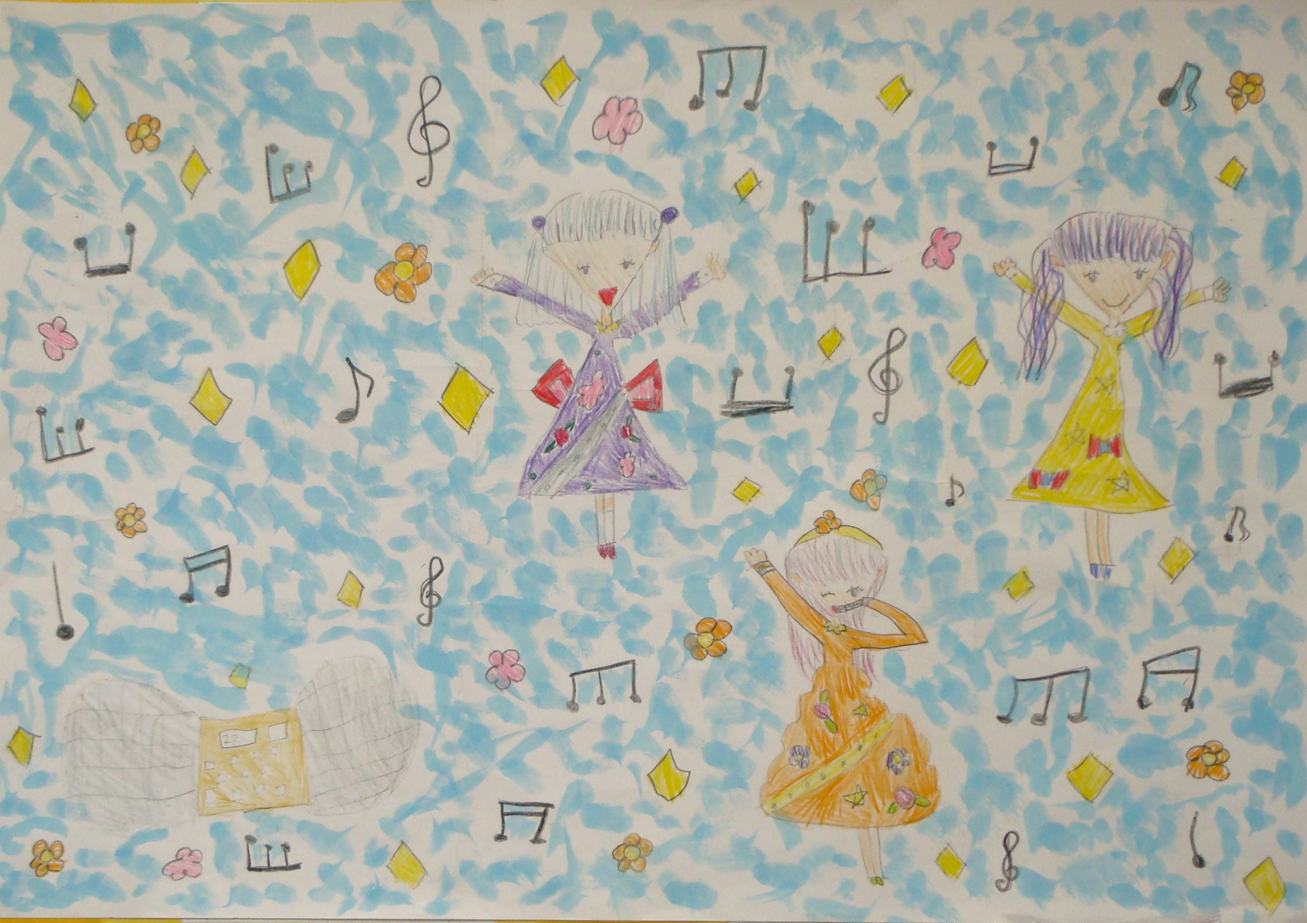 わたしは音がくが大すきです。ゆめで見たのをかいたり、自分でそうぞうしたものをかいたりしました。