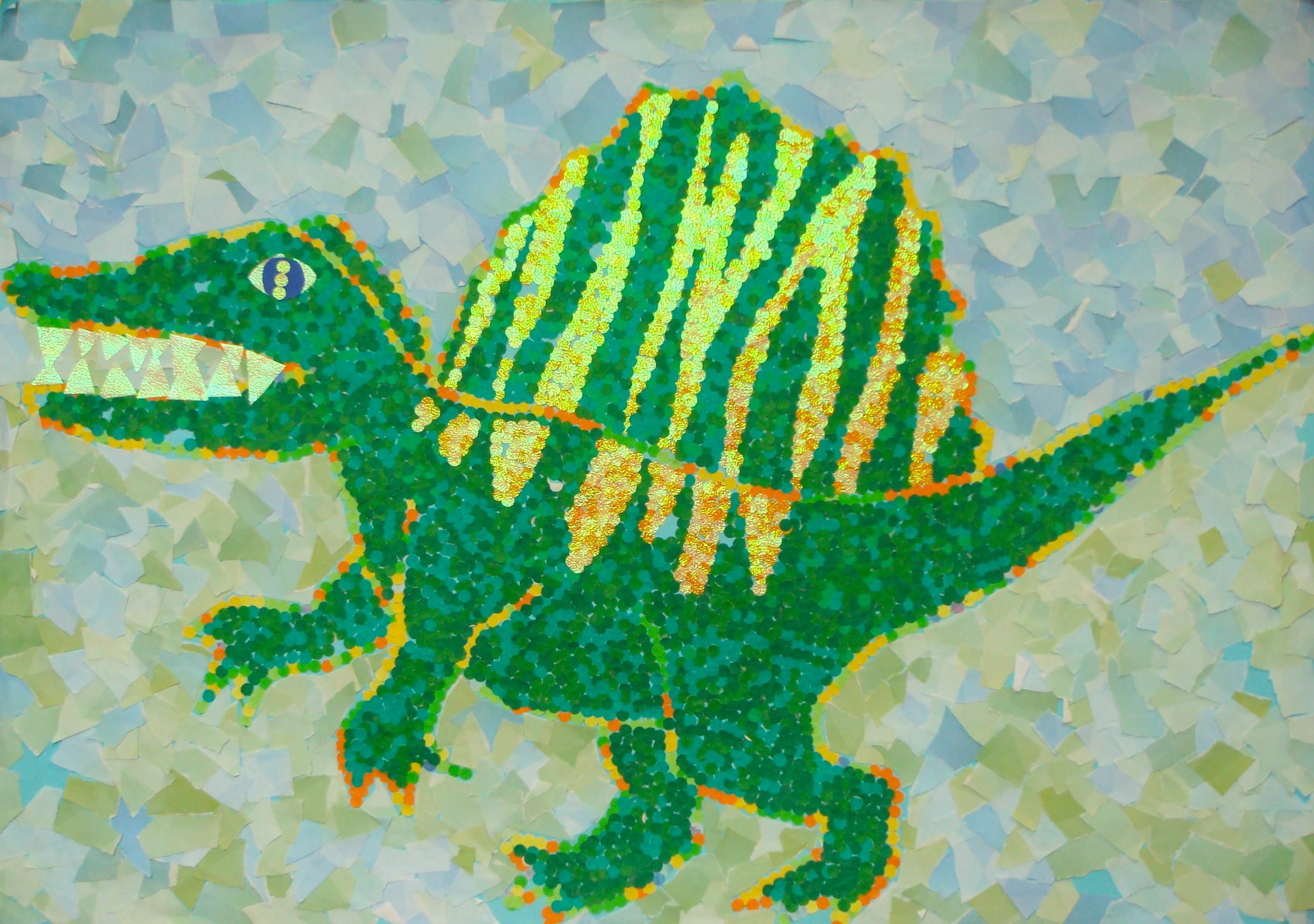 背景を様々な色の紙をちぎって細かく丁寧に貼り付け、また恐竜本体も時間をかけて丁寧に貼り付けて仕上げた作品だ。