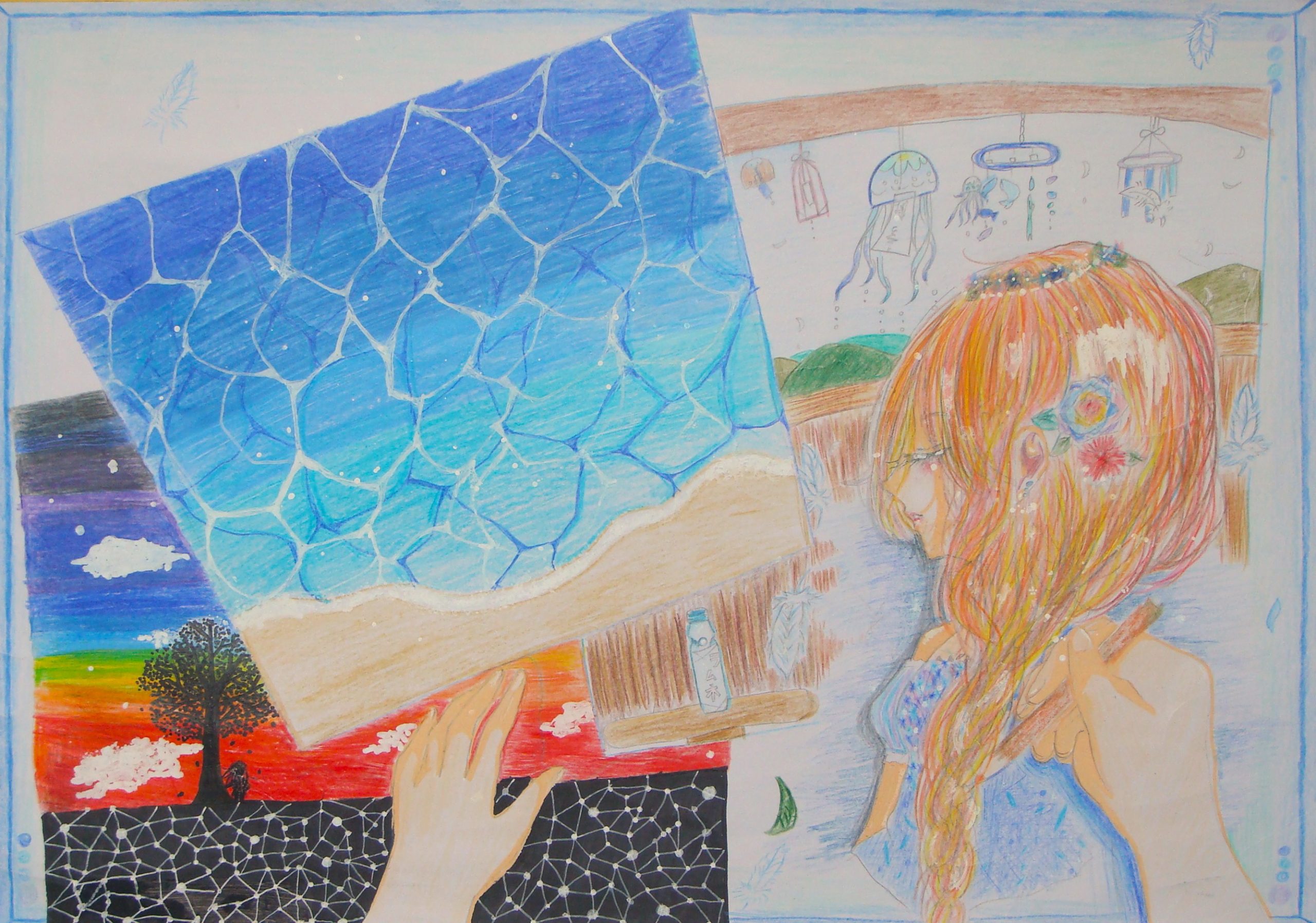 〝私〟は私が好きなこと、すきな景色、これが自分!と言えるようなさくひんにしようと思い、かきました。