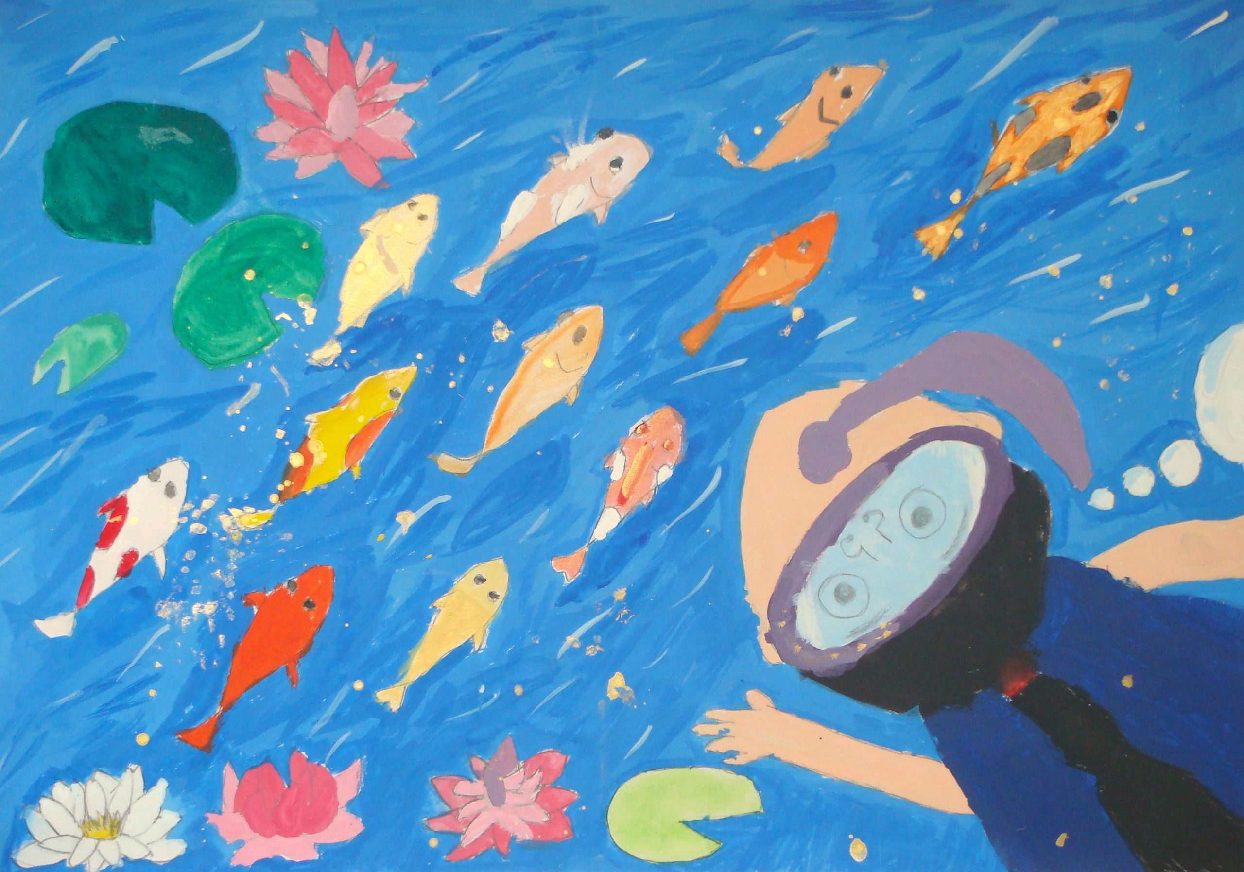 めだかの色や水の色を何色も使って、はみ出さないように気をつけて塗るのが難しかったけど、上手くできて嬉しかったです。