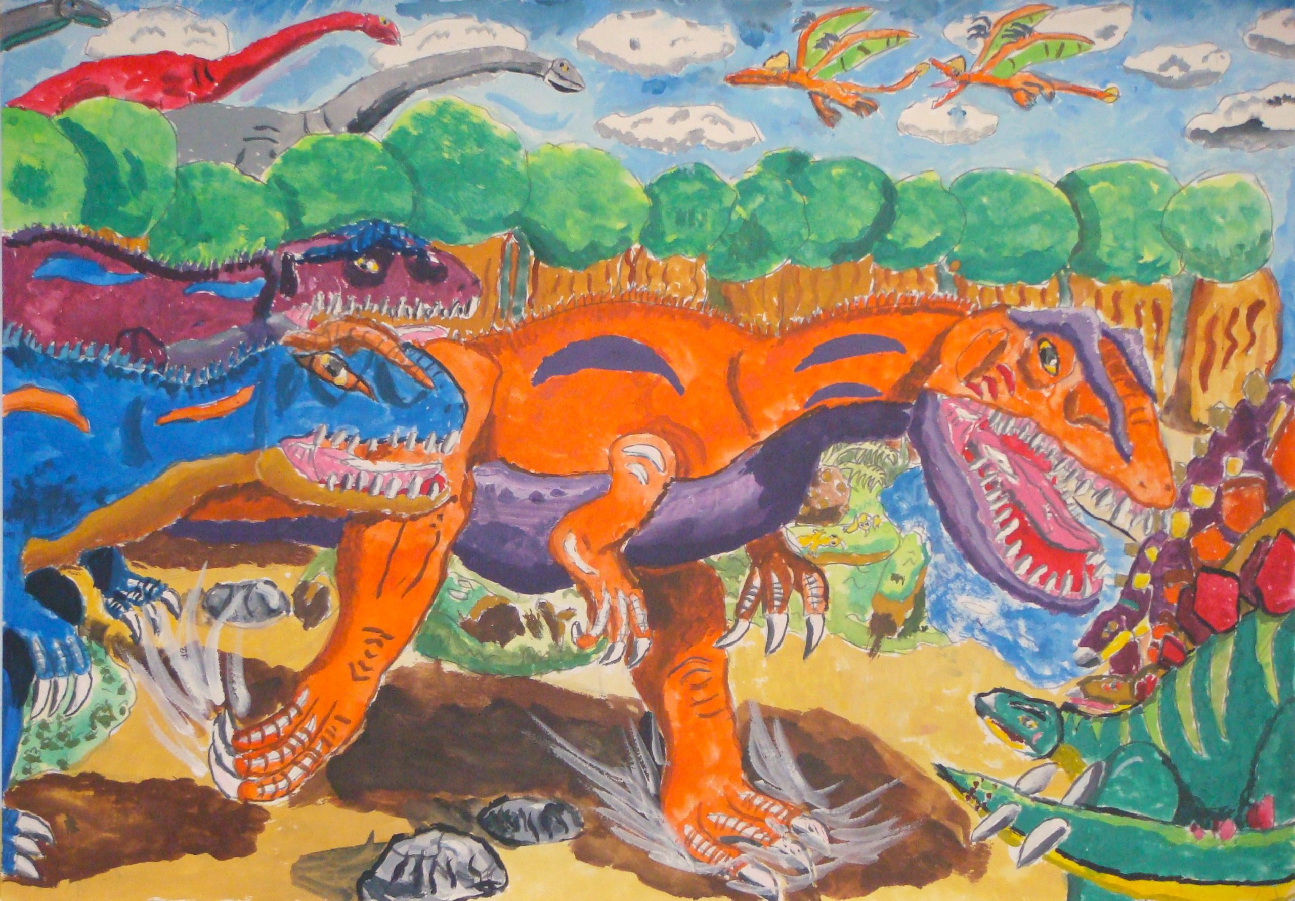 ぼくはジュラ紀の恐竜はこんなふうに生きていたのかなと想像して描きました。