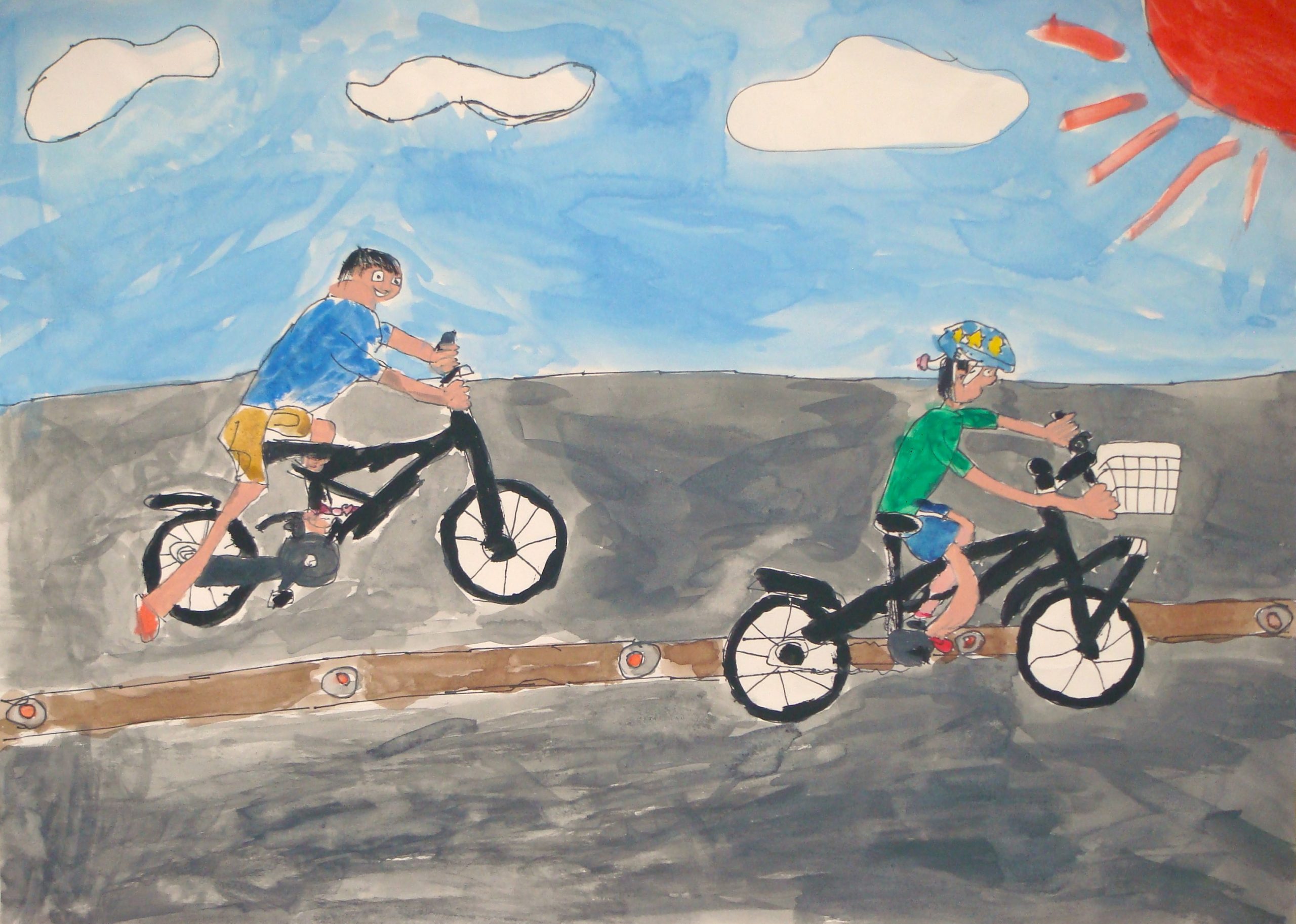 その時のようすを絵であらわしました。がんばったところは自転車です。