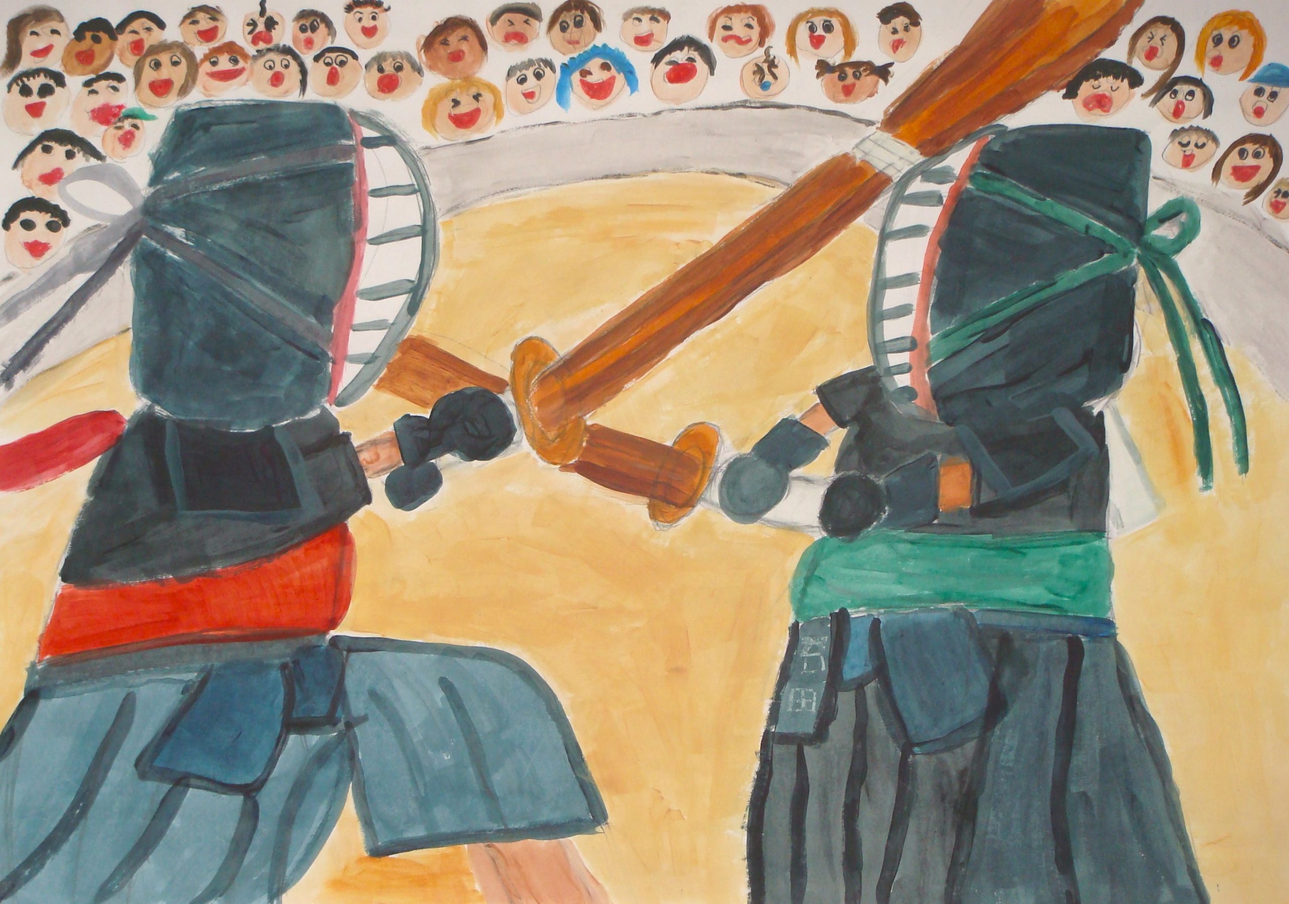 この絵は面で一本にした絵です。しないを少しずつ太くしたり、面を打ったところが目立つように相手の面の近くをこい色でぬりました。