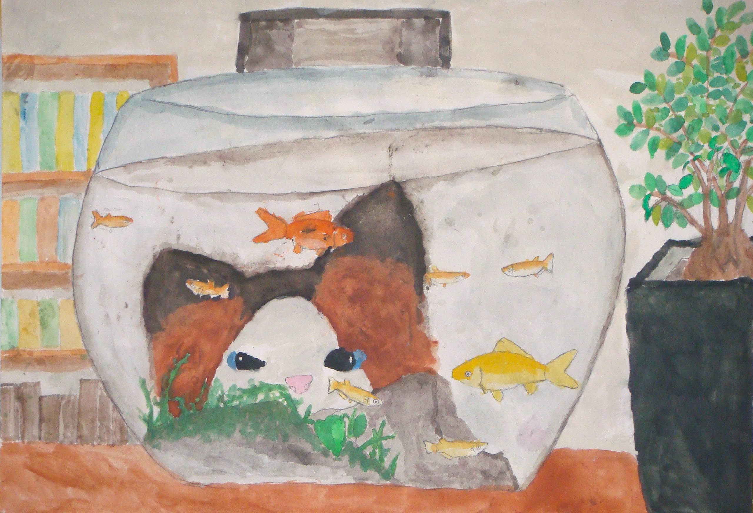 夏休みにぼくのねこがメダカのすいそうをのぞいていて、とてもかわいいと思ってこの絵を描きました。