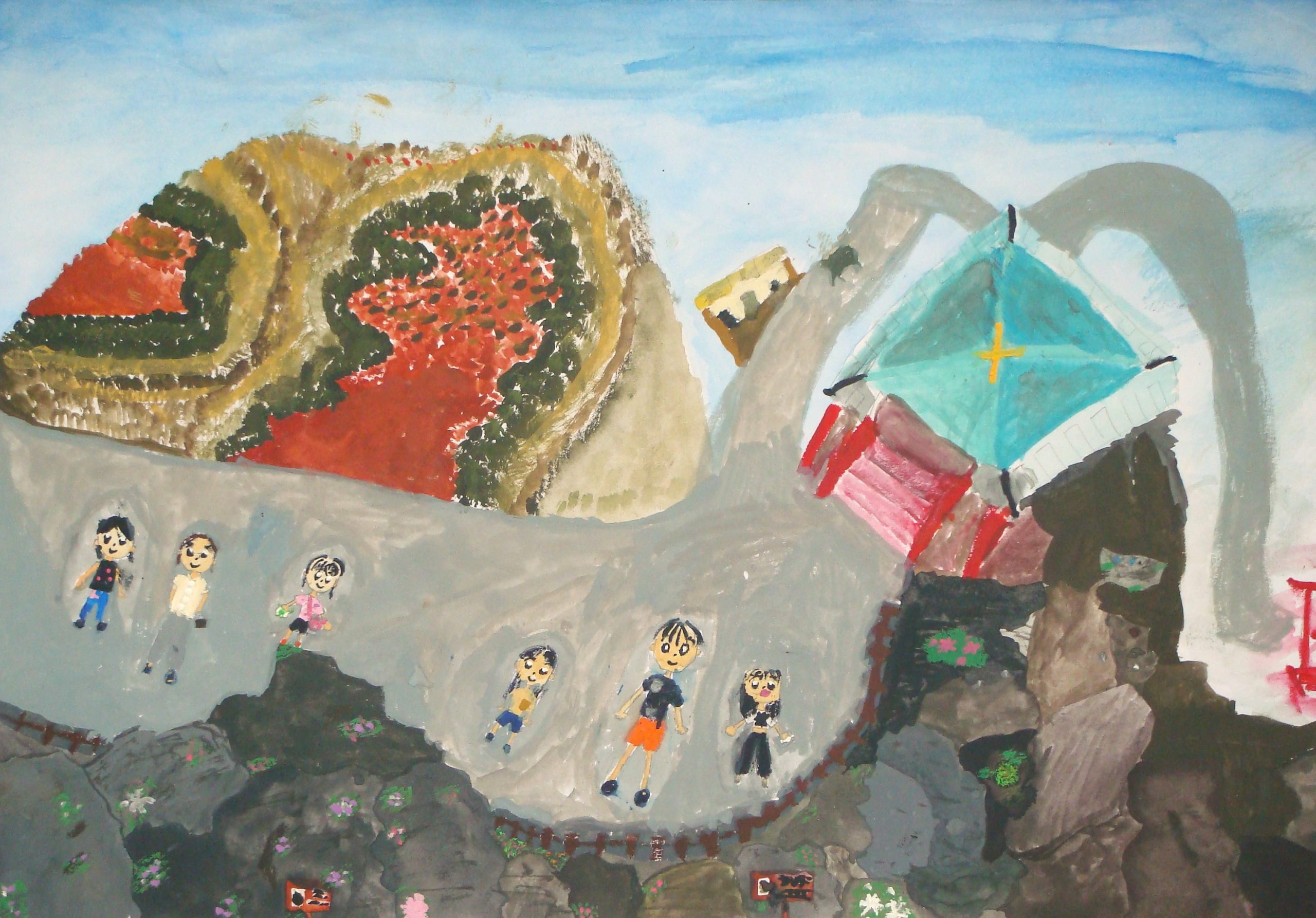 道の描き方も面白いし、家族一人一人の表情や服装に変化を付け、鬼押出し園を楽しんだことを丁寧に表現しています。とても印象に残る絵です。